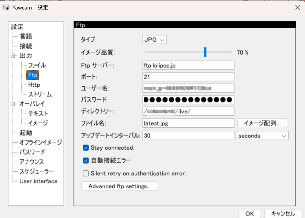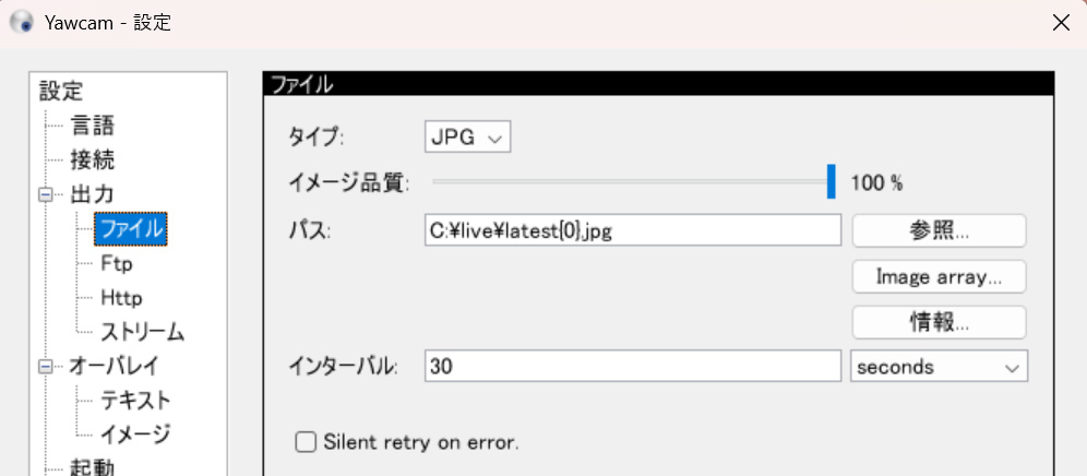 例:C:¥live¥latest{0}.jpg 事前にドライブCにliveというフォルダを作っておいてlastest0.jpgという画像を保存する設定にしました。{0}というのはそこに数字が入り連番になるようです。上書きするので画像が作られるのは1枚だけですが。 - インターバルは30。30秒に一度キャプチャーされる。