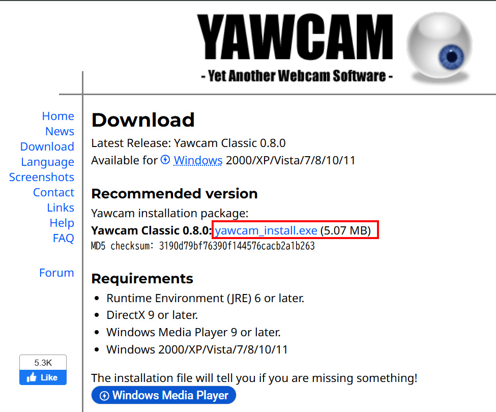 こちらから(https://www.yawcam.com/download.php)YAWCAMをインストール。Javaのページが表示されたらダウンロードした後インストールして下さい。